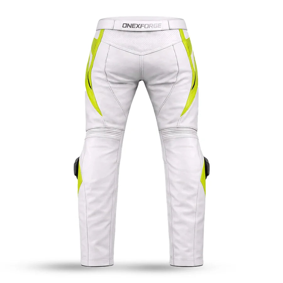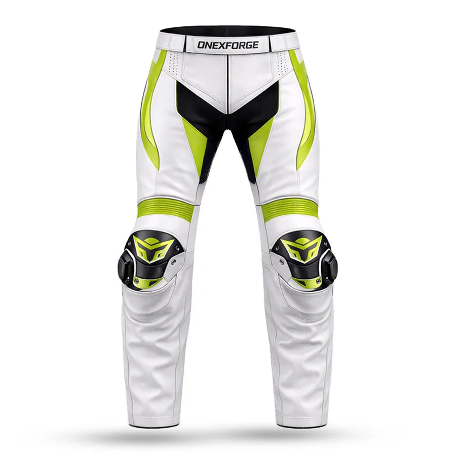 Unleash control with deadly precision in the ONEX FORGE – Arctic Venom leather racing pants — engineered for high-speed riders who ride to dominate, not just participate. Designed with a striking white base and toxic neon green accents, Arctic Venom fuses aggressive style with top-tier functionality.