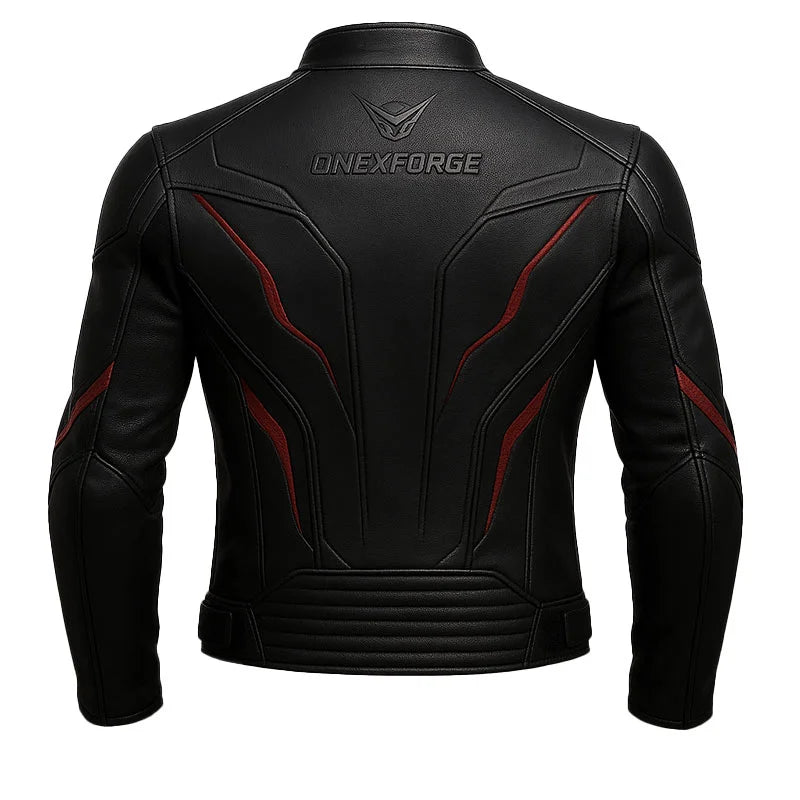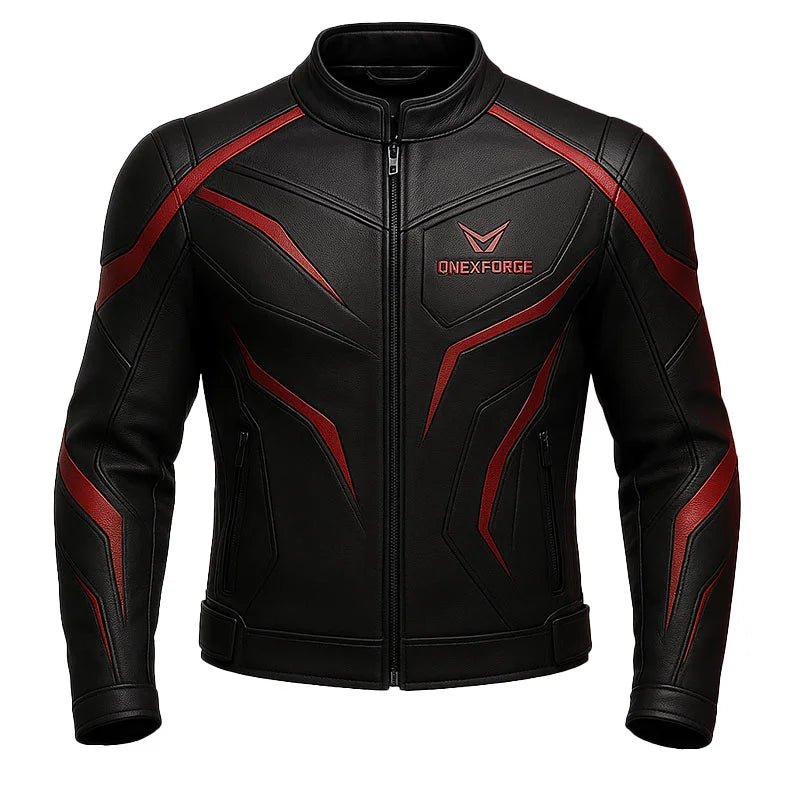 The CRIMSON STING by ONEX FORGE is a bold fashion of streetwear attitude and racing-inspired design. Crafted for style-conscious riders and urban trendsetters, this jacket delivers a sleek, aggressive look with striking red accents against a deep black finish.