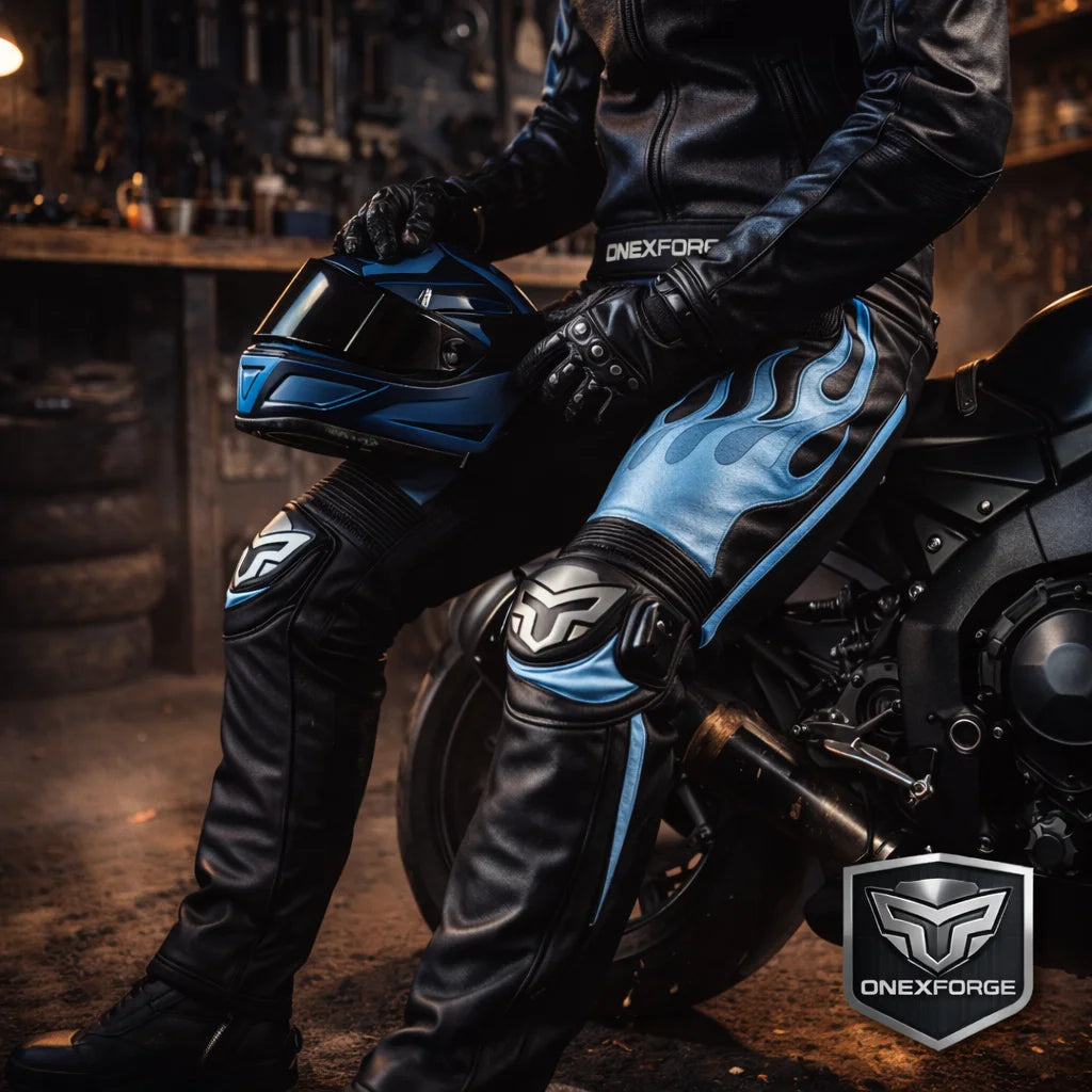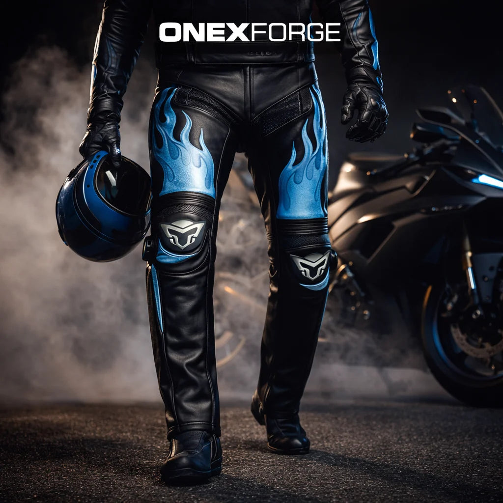 - Our men’s leather motorcycle pants with armor often come in two or more colors, and not just one shade. The contrasting colors are perfect to create a dynamic look.